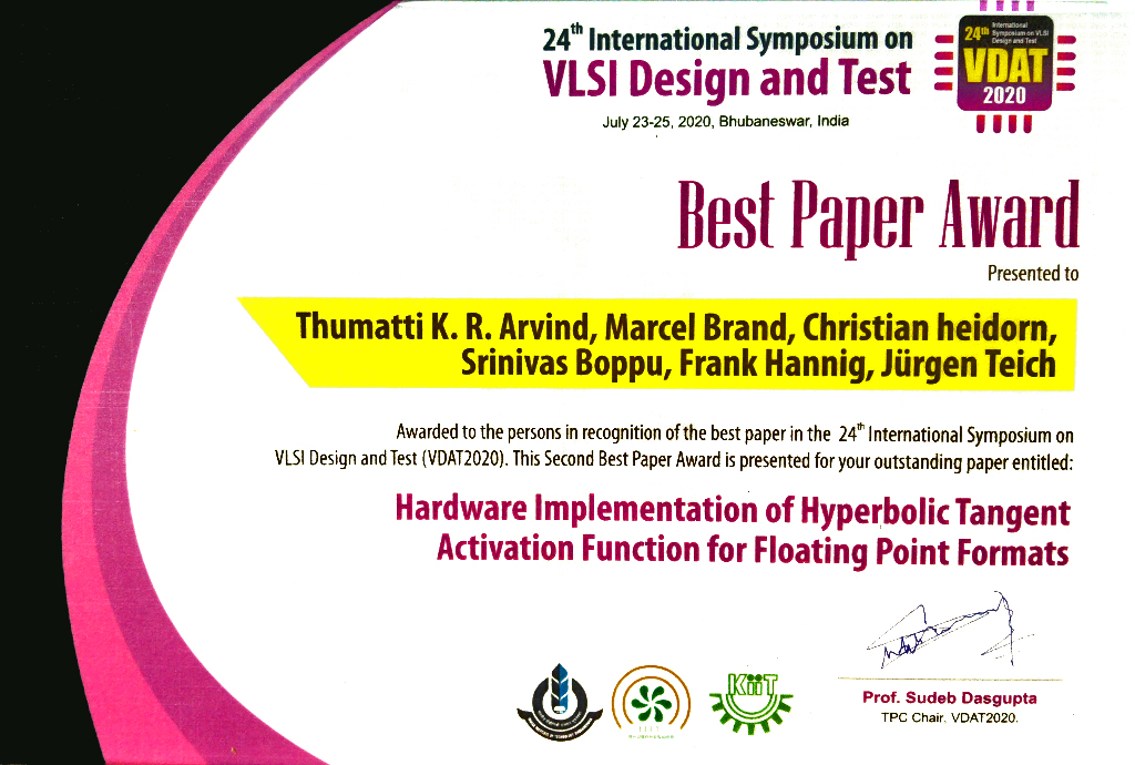 Das Paper „Hardware Implementation of Hyperbolic Tangent Activation Function for Floating Point Formats“ (T. K. R. Arvind, Marcel Brand, Christian Heidorn, Srinivas Boppu, Frank Hannig and Jürgen Teich) hat beim 24th International Symposium on VLSI Design and Test (VDAT 2020) in Bhubaneswar, Indien, den Best Paper Award gewonnen.